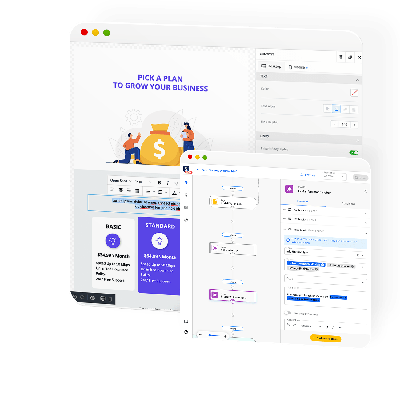 Design email templates easily with our drag & drop email builder. Send emails via UNOY or your own SMTP server and use your custom conditions and data to customise the email content.