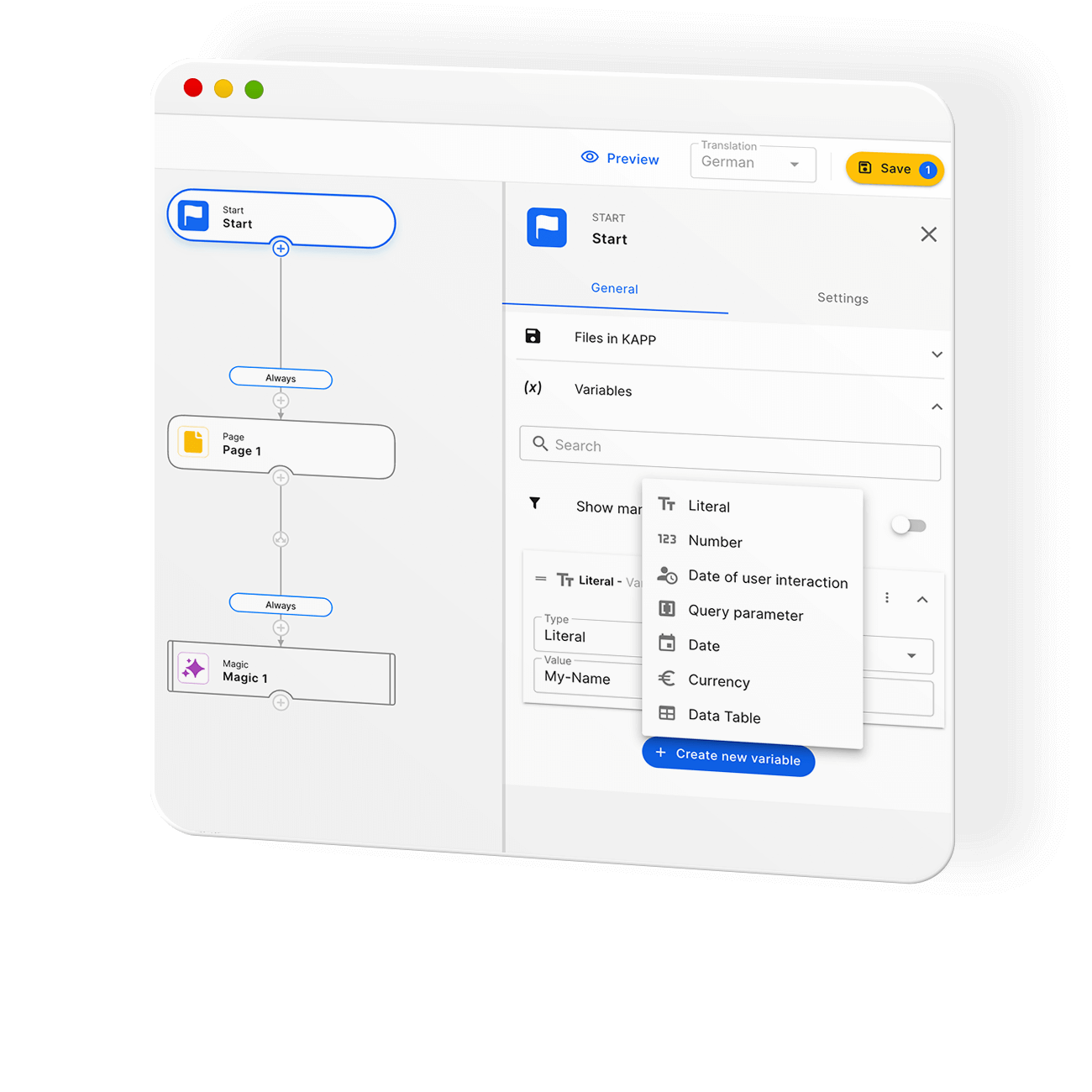 Variables are safely stored texts or numbers that can easily be reused anywhere in your KAPP’s (Knowledge Apps).