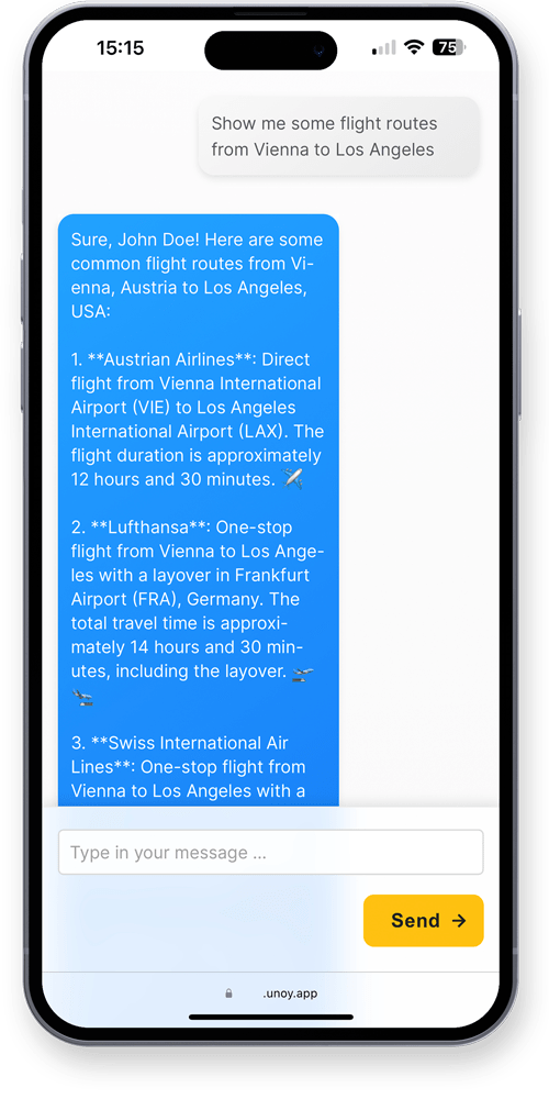 Our UNOY AI Chatbot is your personal digital assistant that is available 24/7. It automates interaction with your customers by answering questions and performing routine tasks. With its help, you can scale your service and serve your customers more quickly.